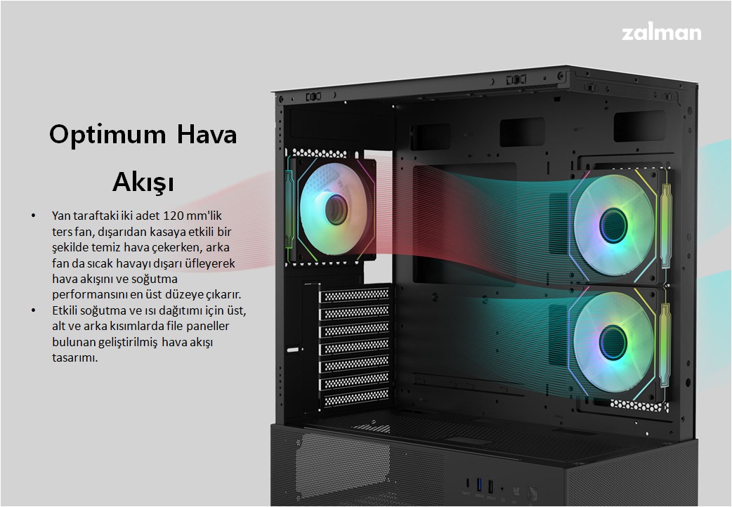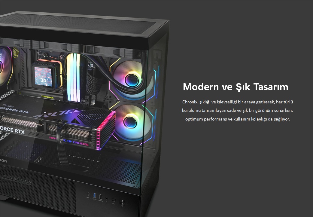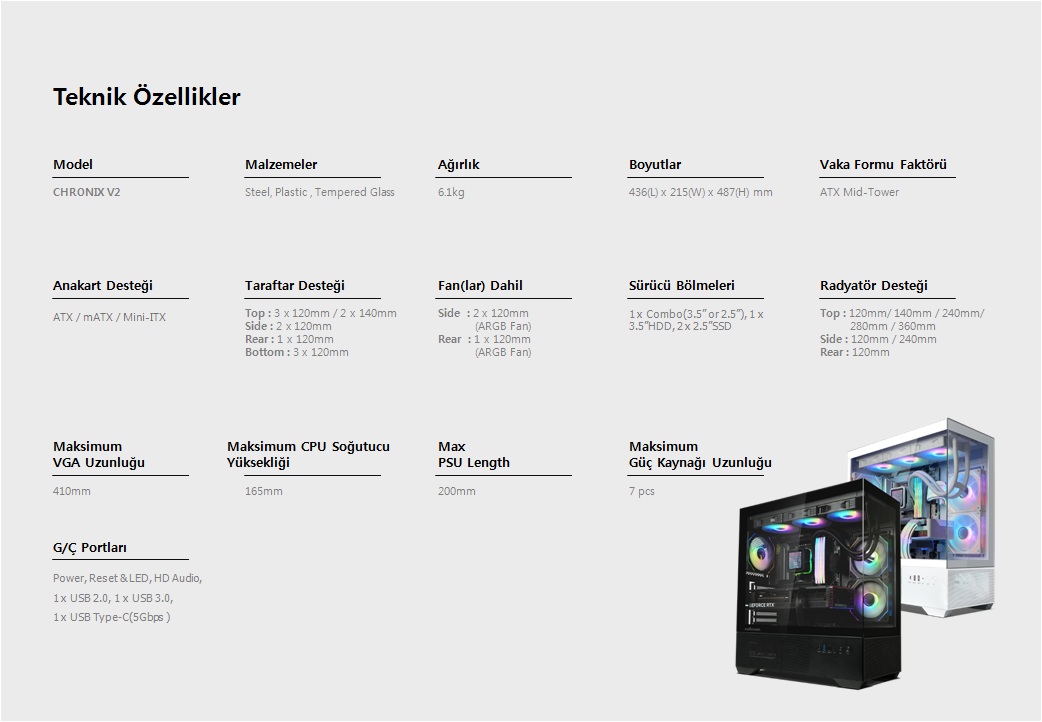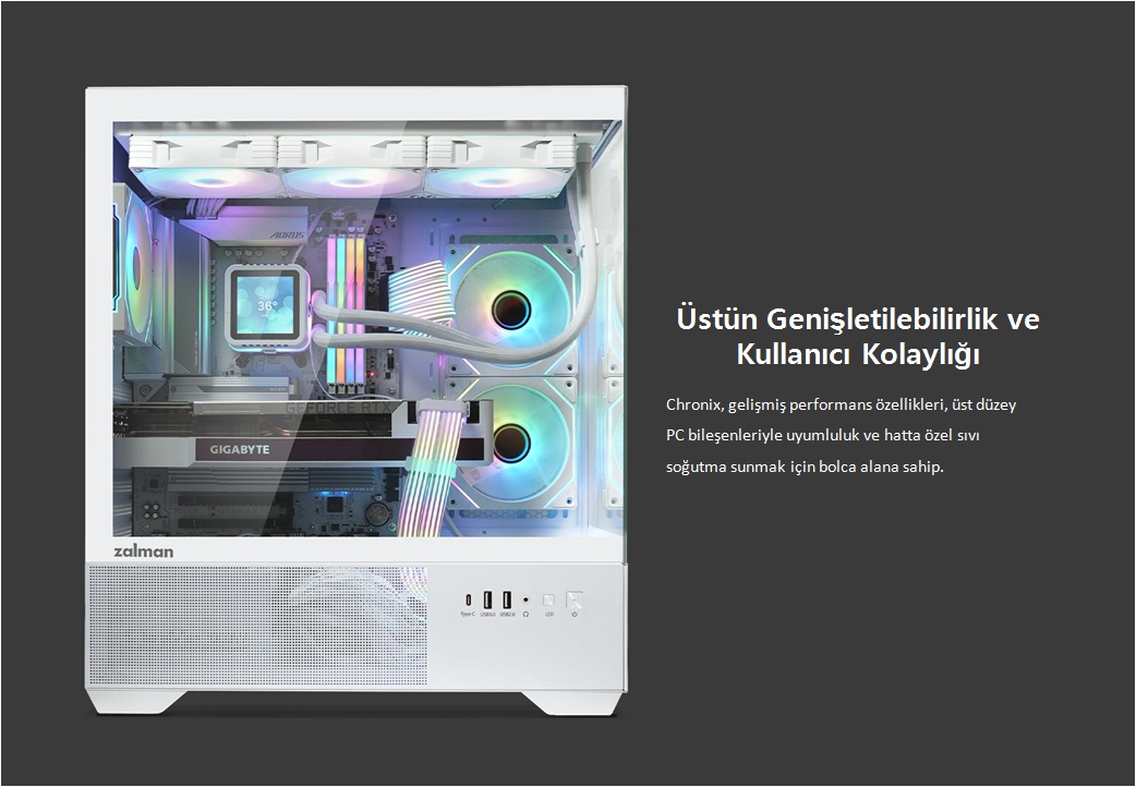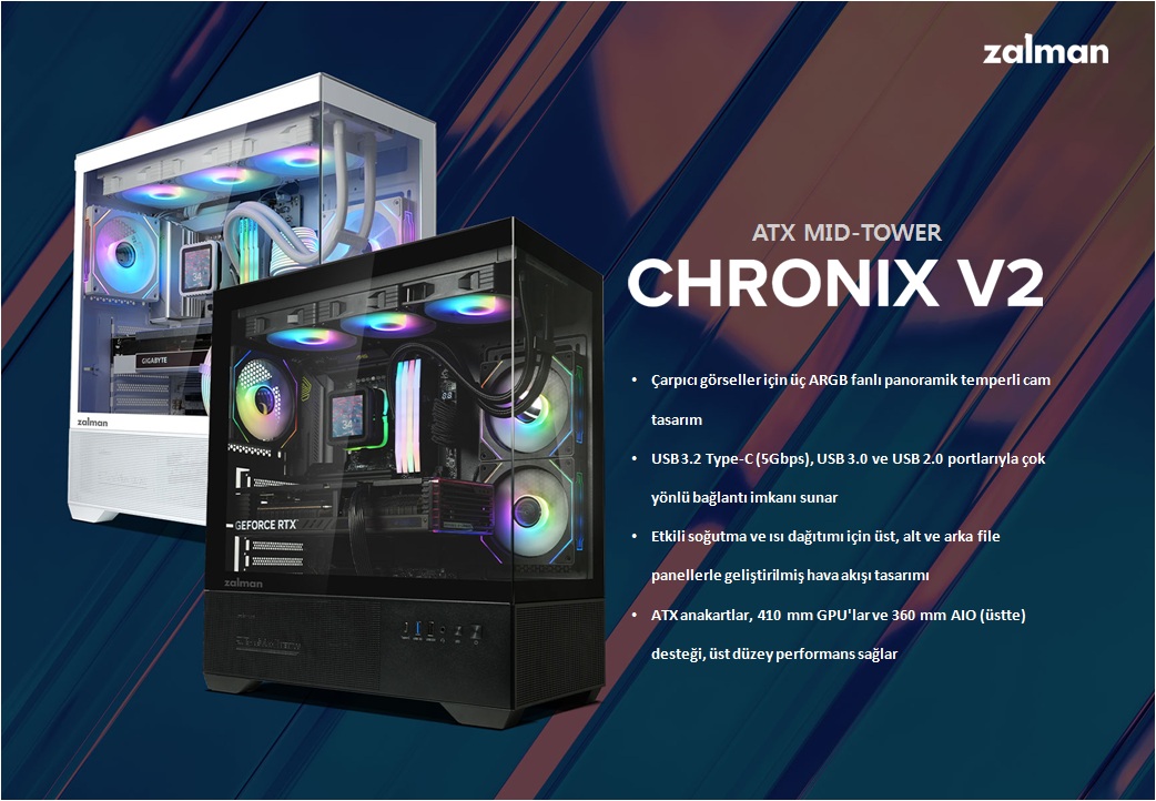 ZALMAN CHRONIX V2 ATX MID TOWER SIYAH KASA 1 X USB 2.0, 1 X USB 3.0, 1 X USB Type-C (5 Gbps),1 X Mikrofon, 1 X Kulaklık, 3 X 120mm ARGB Fan